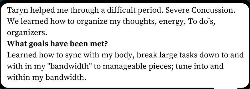 “Highlight of my brain injury journey was being able to work with Taryn. She is calming, comforting and confidence building while also connecting my experience to the brain science.”