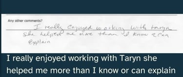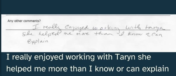 “AMAZING, educated, genuine, thoughtful, patient, understanding, informative... the list goes on and on. Taryn has helped me so much in just a few weeks and I am grateful for her presence in my TBI recovery. I know she will support my journey and encourage me. ”